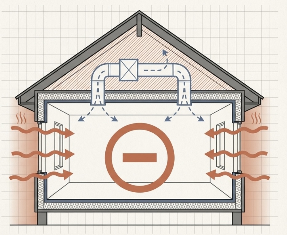 Windows may be heavily covered or blacked out. Ventilation may look improvised — windows open in freezing weather, portable fans running in unusual configurations, makeshift ducting pushing air out of non-typical locations.